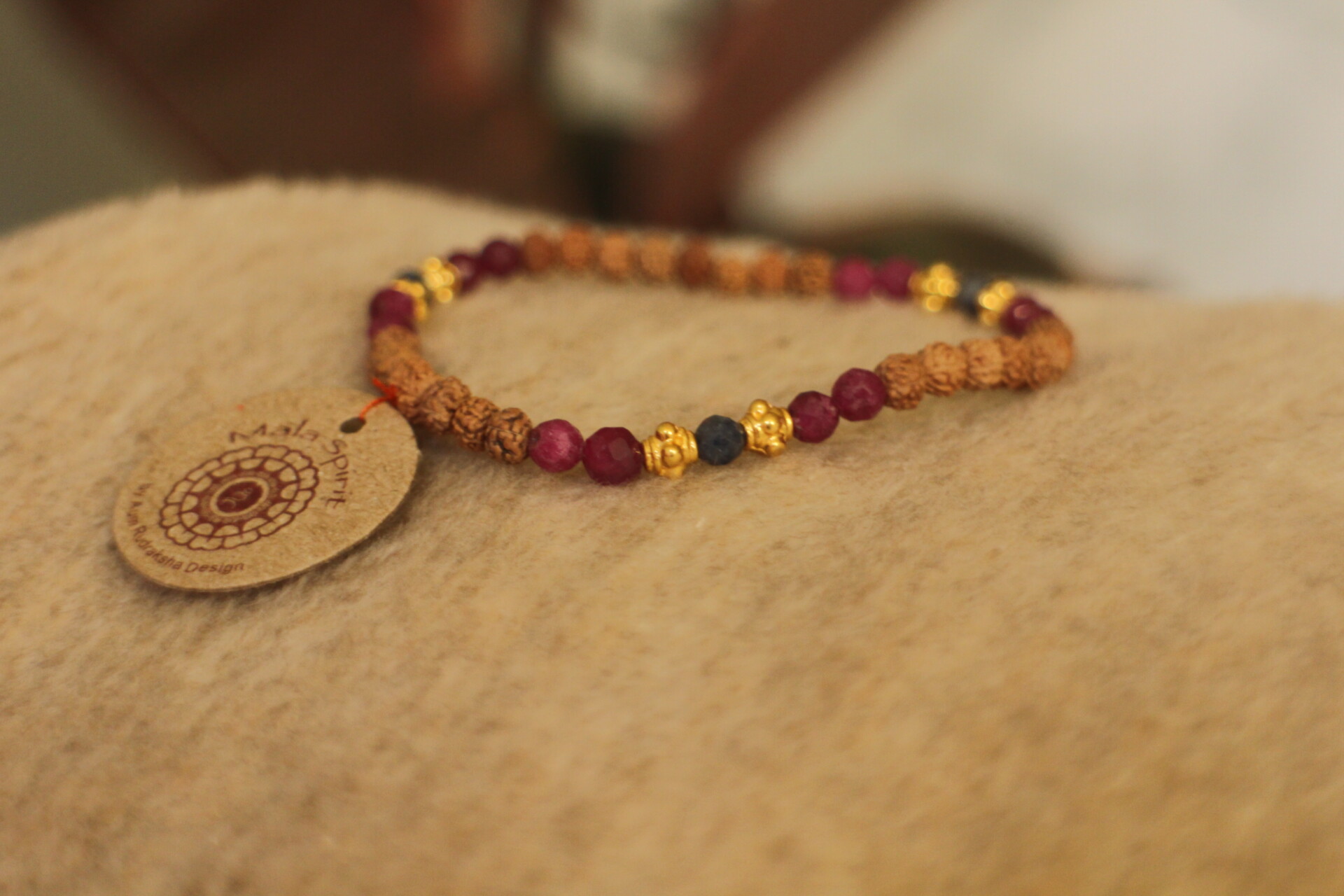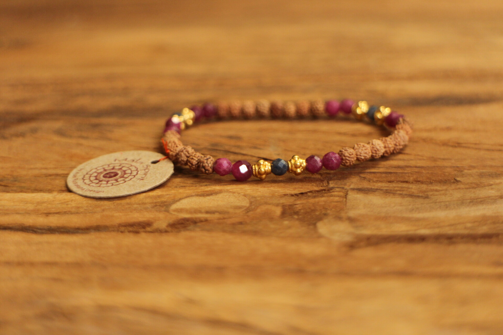 Robijn en Saffier armband, niet zomaar een armband, krachtig, ongeremd gepassioneerd én zuiverend. Gecombineerd met Rudraksha en vergulde zilveren kralen.